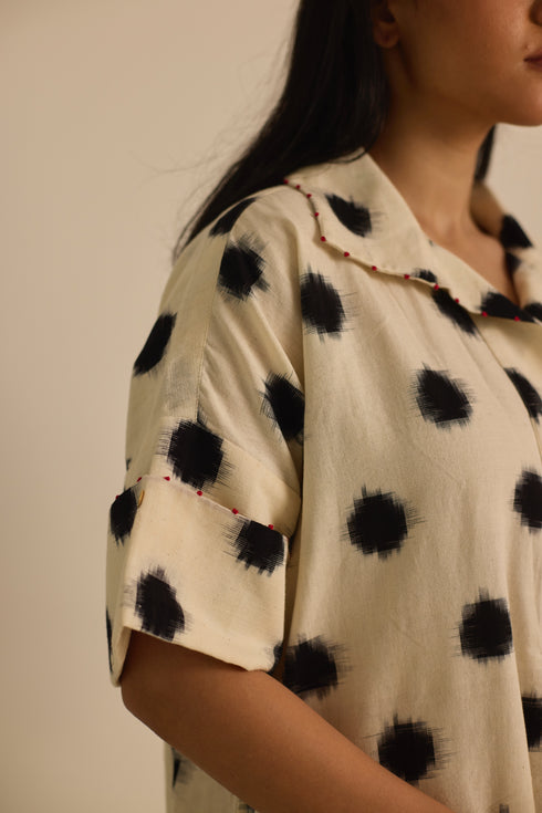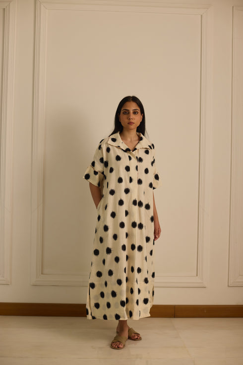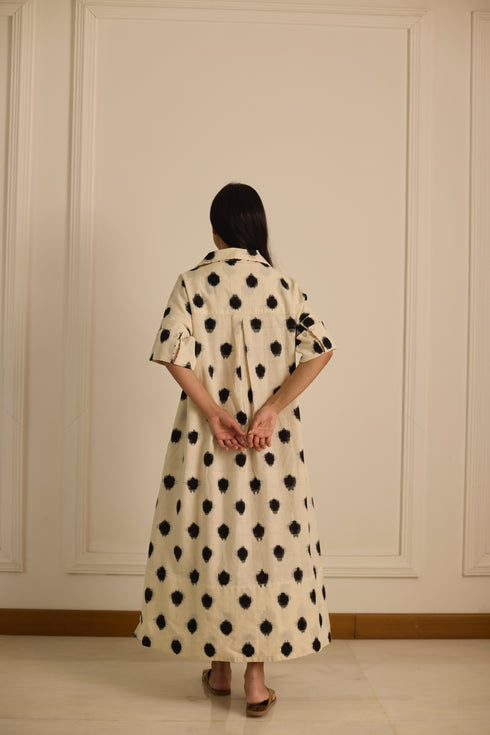 The loose, A- line and flowy dress can be a perfect addition to your summer wardrobe. This shirt dress with short sleeves and two piece collar is a very comfortable and versatile piece. The sleeves and the neckline is finished with french knots in contrasting colours.